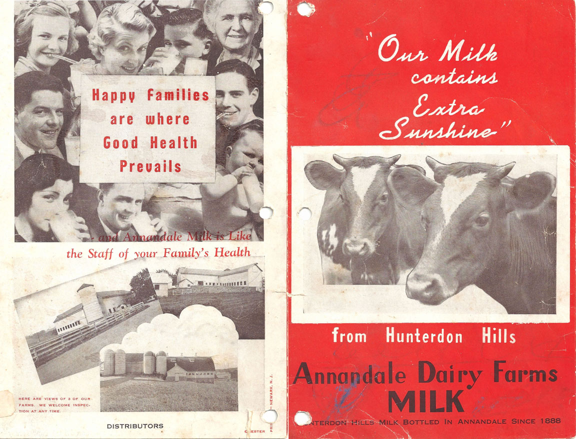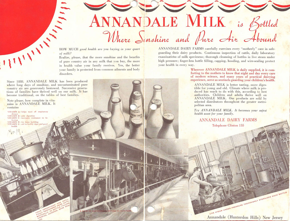 C.T. Smith's Creamery - from 1892 and 1897 Sanborn Map Borden's Condensed Milk Co. - from 1903 Sanborn Map Annandale Milk & Cream Co. - from 1912 Sanborn Map F.G. Sharp's Annandale Creamery - from 1921 Sanborn Map Hunterdon Hills Milk & Cream Co. (Annandale Dairy Farms) - from 1945 Phone Directory