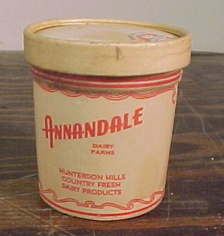 Cottage Cheese container from Hunterdon Hills Dairy. Measuring 4" high with a 3" diameter and coated in wax.