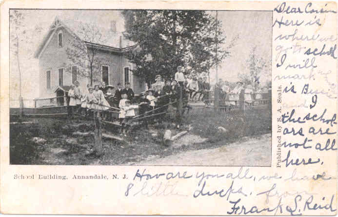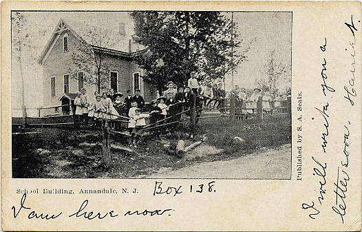 TOWNSHIP SCHOOLS excerpt from History of Hunterdon and Somerset Counties, New Jersey, with illustrations and biographical sketches of it's prominent men and pioneers (1881). (Cornell University Library) The school districts in Clinton township are numbered 54, 55, 56, 57, and 58, and named respectively Annandale, Bray's Hill, Lebanon, Bound Valley, and Hamden. Mr. John S. Cramer recollects attending school in the Annandale District as early as 1803, in a log school-house that stood near Peter H. Huffman's. The teacher was Sallie Price, and among the scholars were John Aller, John and Peter Huffman, and Ann Huffman. A second log school-house was built pretty soon after that, just north of the present Stout place, and to that school went John S. Cramer, John Grandin, Mary and Sallie Fox, Ann and Betsey Cregar, William Hunt, Ishe Hunt, and Philip Grandin. Of course there were other scholars, but their names cannot be recalled. There had to be twenty- five scholars to make a school, and some of them had to come a long way. The teacher in that second log school-house was William Thatcher. Not many of the pupils are left. Thatcher was also a teacher in the red school-house, near the Stout place, and third in the list of remembered school-buildings. The second teacher in the red school-house (next following Thatcher) was Charles Q. Phillips. The fourth schoolhouse was built in 1836, and occupied a site about opposite the Dutch Reformed church. The building now occupied by the district school in Annandale was erected in 1865 for a public hall, and since 1869 has been the property of the district. It is a three-story frame structure, with seating capacity for about 250, although the average attendance does not reach beyond 100. E. C. Harvey is the principal, and Maggie Eockhill the assistant. The trustees are William A. Young, George Creveling, and J. H. Miller. |
