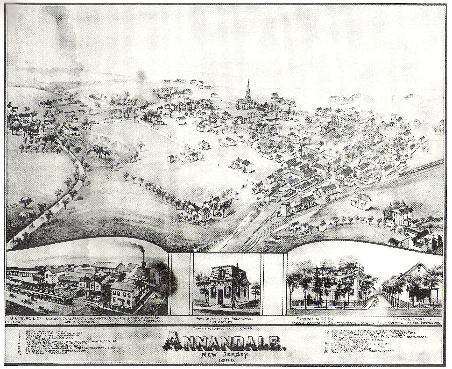While the cheese factory eventually went out business (and was converted into a dwelling), it was succeeded by a creamery (#83), one of the first in Hunterdon County, established during the 1880s along the railroad tracks west of the depot. As peaches became an important local crop, Annandale emerged as a shipping center for the highly perishable fruit, which according to an 1885 state business directory, had become the principal product shipped from that point. In 1890, local growers organized a peach exchange at Annandale; its auctions were held in a small building at the lumber yard. The village acquired another store (#69) in 1886; built by Jacob F. Fox next to the church, it was successively enlarged as his business expanded, developing into what was described, no doubt with some hyperbole, as a "veritable department store such as may be seen in the great cities with an emphasis on furniture. The hotel (#64) also was enlarged in the late 19th century, and an insurance agency was established, occupying a small mansard-roofed office on West Street in 1886. Census data and directories reveal that the population of late 19th-century Annandale, which numbered several hundred, was occupationally diversified with a variety of workers, artisans, business Section Number 8 Page 5 men, and professionals. Residents' occupations during the period included merchants, laborers, carpenters, quarry workers and stone masons, shoemakers, carriage and wagon makers, a lawyer, doctor, school teacher, clergyman, telegraph operator, station agent, insurance agent, grocer, drover, huckster, and a "whip seller". Village streets must have been improved by the installation of plank sidewalks at a fairly early date since, in 1874, the Clinton newspaper noted that "new sidewalks are being laid with the best timber on the principal streets." Plank walks eventually were replaced by flagstone like those laid around the hotel in 1897. A noted improvement, not shared by many rural villages, was the creation of a water supply system in the late 1800s by the Clinton Water Company; pipes were laid in the streets of Annandale during the summer of 1897, fed by gravity from a reservoir to the north near Petticoat Lane. A fire company was formed in 1896, housed in a small building (#59) remodeled from or replacing a shop on West Street. The 1886 bird-eye view indicates that since 1873 about one dozen houses had been built around the village. After about 1890, and especially in the first decades of this century development was concentrated on the south and west sides of the community. A substantial new school house (#43) was erected in 1888 on the southern edge of the village. Maple Avenue was laid out in 1896 by Jacob Fox on land purchased from George Cregar; in the following year he began construction of a house (evidently #13) on the corner of the new street and Beaver Avenue which upon completion was described as the most attractive and best appointed dwelling in town." A number of substantial houses were subsequently erected on Maple and Beaver Avenues, as well as some more modest bungalows. No doubt in response to increasing automobile and truck traffic through the village on Beaver Avenue, the old turnpike which was eventually improved, paved, and incorporated into the new state highway system, two automobile service garages (#s 32 & 36) and a general store (#37) were built there around World War I and later. In 1928 a brick school building (#39) of progressive modern design was constructed on the new Allerton Road. While peach growing in Hunterdon County declined rapidly in the early 20th century, Annandale still remained an important shipping center for the crop (the "general market place" according to a 1918 industrial directory); within a few years, however, the peach exchange was discontinued as peach growing became an insignificance Section Number 8 Page 6 local crop. The creamery continued to operate into the Depression era, but eventually went out of business as farmers switched to selling milk to large dairies which used truck transportation. Freight and passenger traffic declined on the railroad, as motor vehicle traffic increased; the freight station was removed sometime in mid century, while the underutilized passenger station survived until recently. As local residents could easily travel elsewhere to shop, Annandale's general stores closed, leaving only the one on Beaver Avenue still open. The hotel also closed and was converted into apartments. Of Annandale's 19th-century enterprises only the lumber yard, minus its planning mill and coal yard but retaining the original store and later sheds. remains in operation. Annandale exists today as a largely residential community whose late 19th/early 20th-century character survives substantially intact, despite the surrounding residential and commercial development of recent years stimulated by the completion of Interstate Route 78 just south of the village. Although many nonresidential uses in the village have disappeared, the buildings that housed them mostly remain. Modern alterations and deterioration, however, threaten a number of district buildings, and the remaining open lands surrounding the village are subject to growing development pressure. Responding to these conditions, local residents have become increasingly aware of the community's special historical and architectural heritage which make it a worthy candidate for inclusion on the National Register of Historic Places and the desirability of preserving that heritage. |